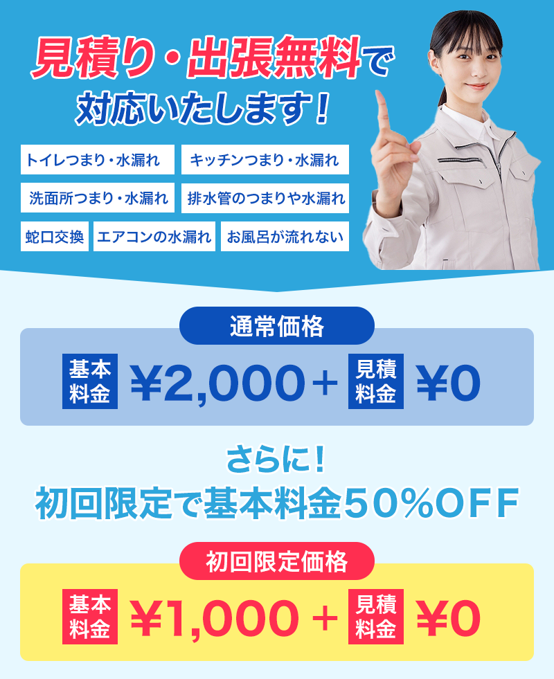 初めてご利用の方は基本料金50%OFFでご利用いただけます。万が一、施工後1年以内に再度トラブルが発生した場合は、無料で修理をさせていただきます。