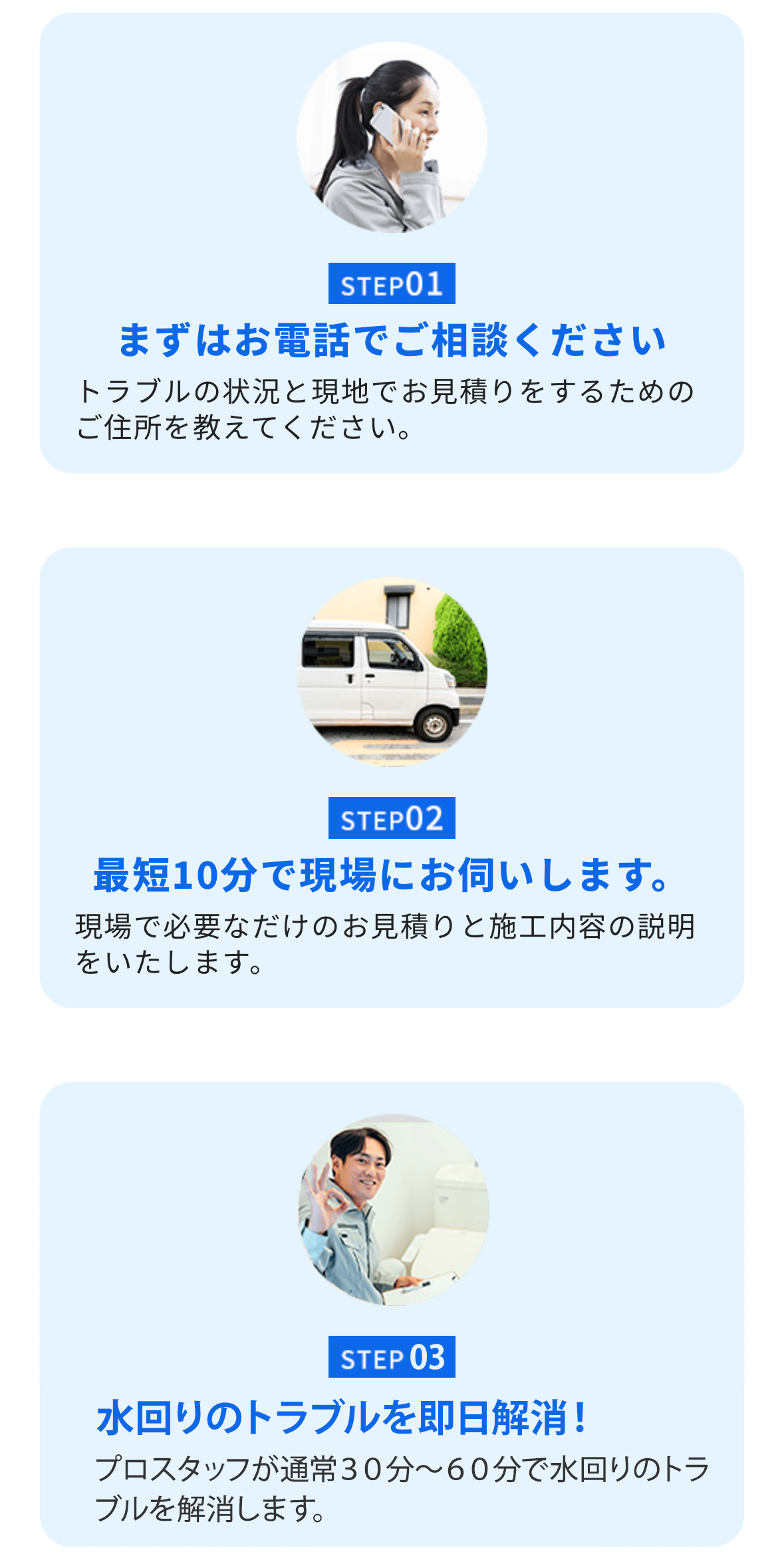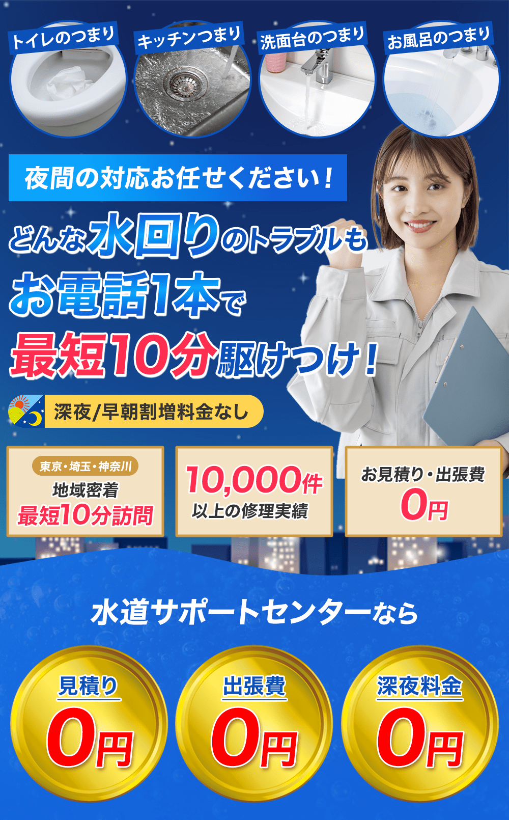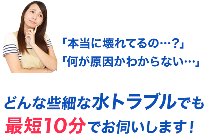 緊急の水トラブルでも深夜・早朝、土日祝日関わらず経験豊富な職人がすぐ駆けつけ確実に修理します。 -