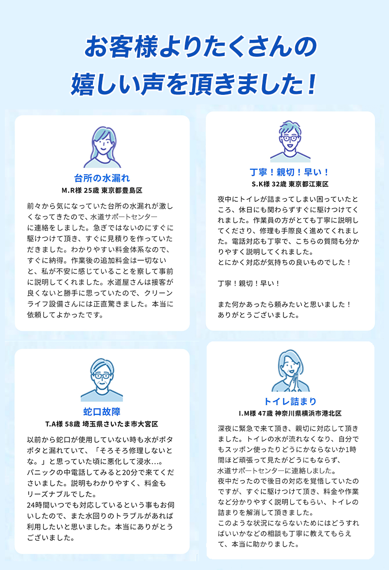 これまでに10,000件以上の施工実績を積んできた経験豊富な職人が水トラブルを解決。多くのお客様から信頼をいただいております。 -
